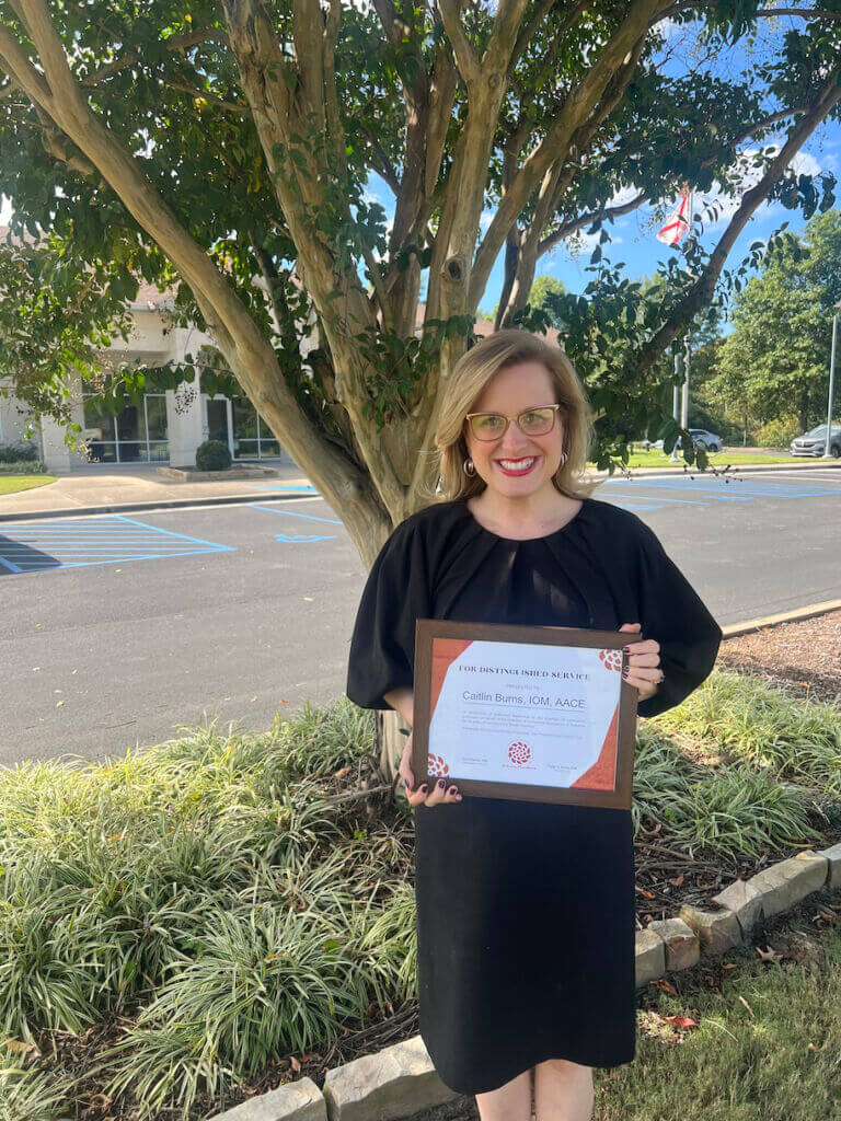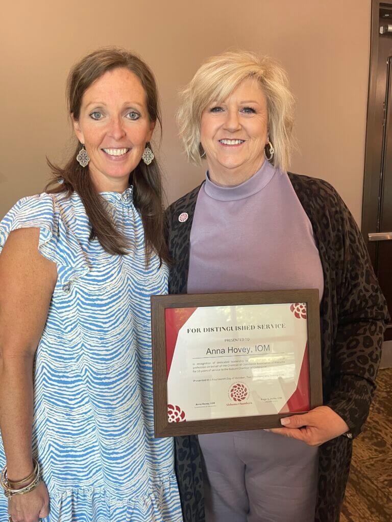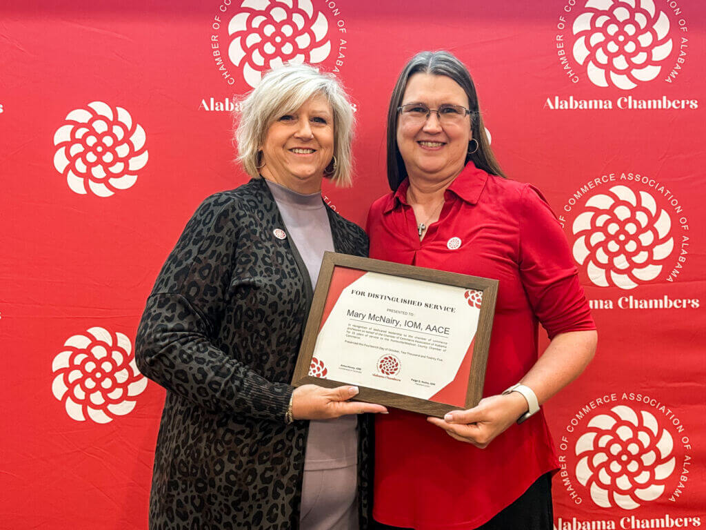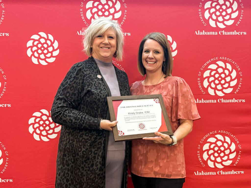 During the 2025 Alabama Chambers Professional Development Conference presented by Alabama Self-Insured Worker's Compensation Fund, held in Tuscaloosa, AL, five chamber professionals were recognized with the Distinguished Service Award for their career achievements and tenure of service to the chamber industry. Professionals are eligible for recognition following 10 years of service to the profession. Those receiving recognition this year include the following: Caitlin Burns, Shoals Chamber, 10 years; Sandy Williams, Elba Chamber of Commerce, 20 years; Kristy Drake, Huntsville/Madison County Chamber, 10 years; Mary McNairy, Huntsville/Madison County Chamber, 15 years; and Anna Hovey, Auburn Chamber of Commerce, 10 years.